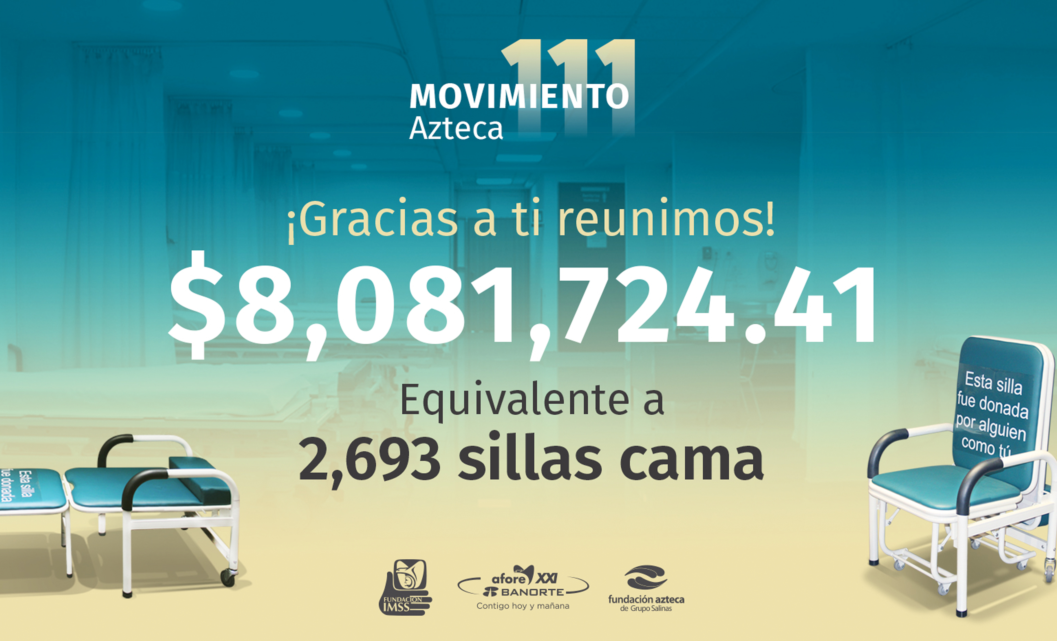 En su edición 111, Movimiento Azteca convocó a la sociedad a contribuir con un donativo para la adquisición de sillas cama para hospitales del IMSS. Una persona hospitalizada puede estar en promedio hasta seis días en el hospital. Esto equivale a 144 horas, tiempo que también pasará en ese lugar el familiar que le esté acompañando. Por ello, las sillas cama son de gran importancia, ya que permiten que los acompañantes de los pacientes tengan un espacio más digno para descansar, mientras los apoyan y asisten durante la hospitalización.