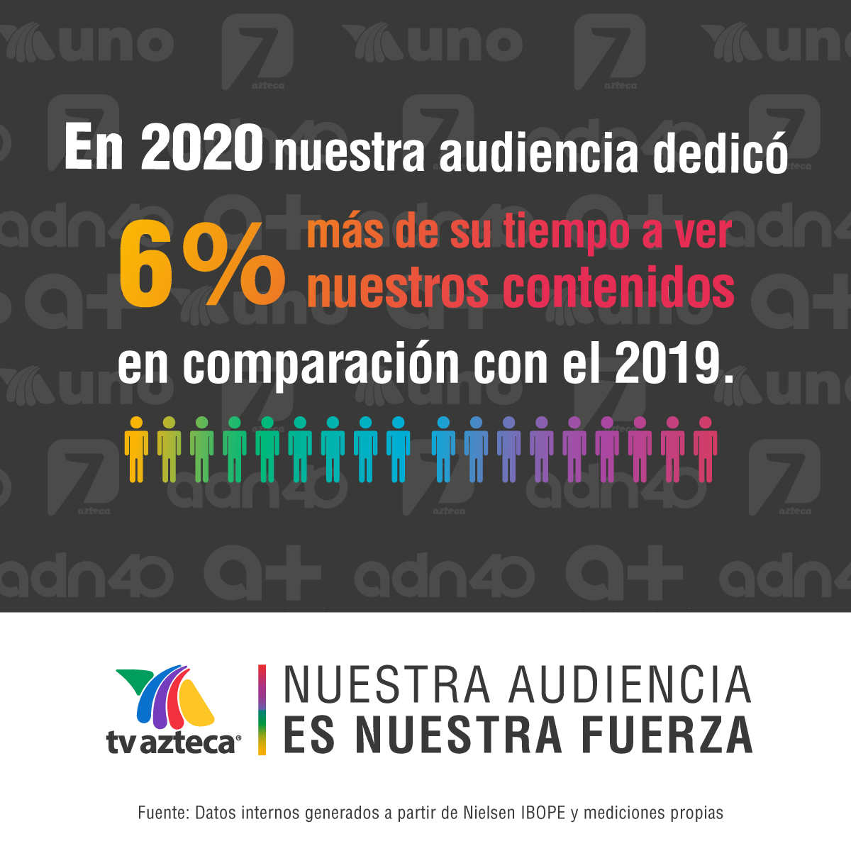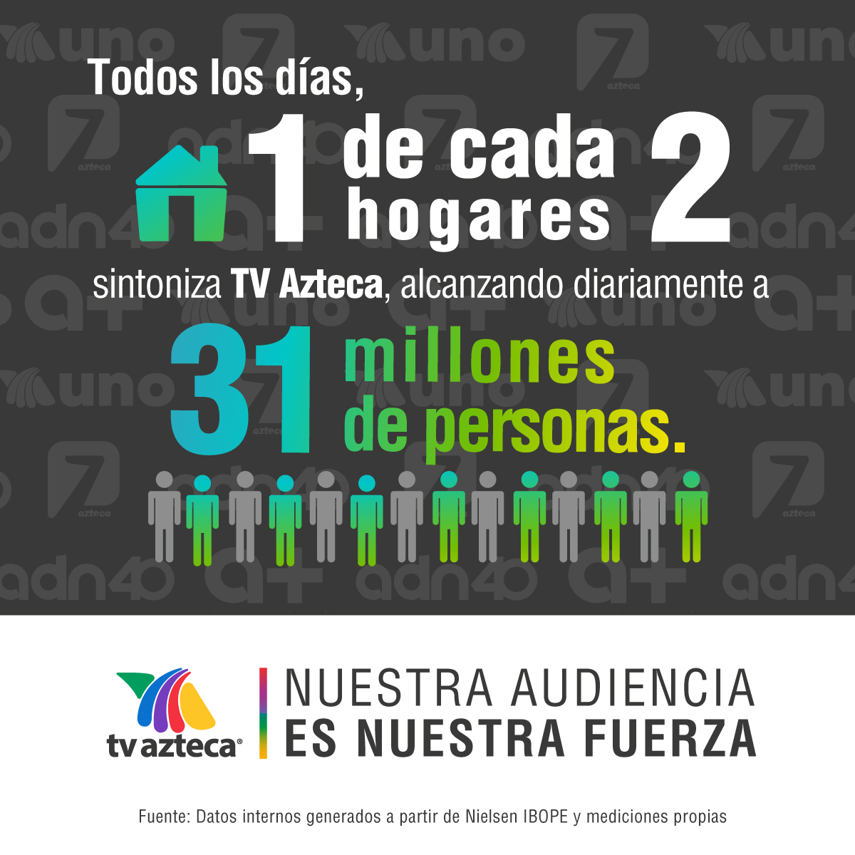 En relación a Azteca Uno, alcanzó a 102 millones de personas, así como al 95% de los hogares (más de 32 millones). Semanalmente, 61% de las familias ha sintonizado Azteca Uno (más de 20 millones de hogares). Todos los días, Azteca Uno se ve en más de 10.4 millones de hogares (3 de cada 10 familias). Un dato sobresaliente fue que nueve de cada 10 hogares se informaron a través de nuestros noticieros, alcanzando a más de 82 millones de personas en el año.