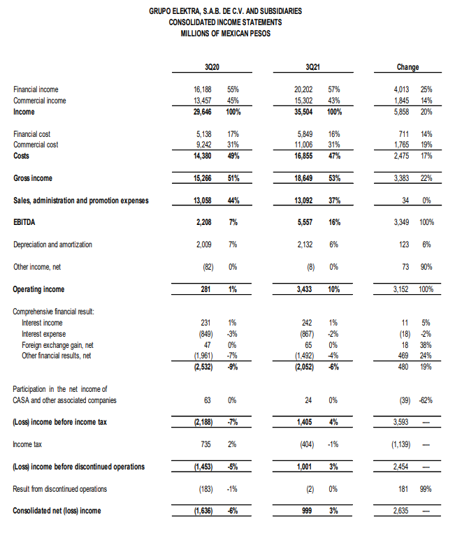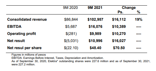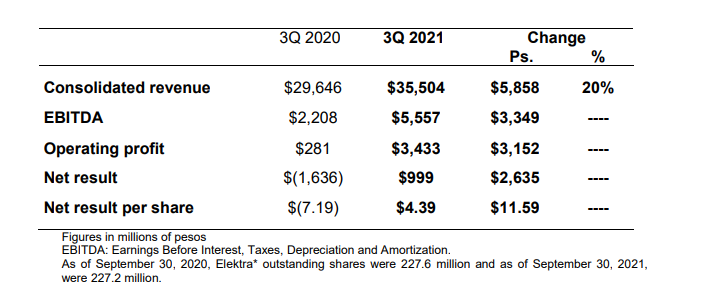 Grupo Elektra announces remarkable 1.5-times growth in EBITDA, to Ps.5,557 million in Q3 2021