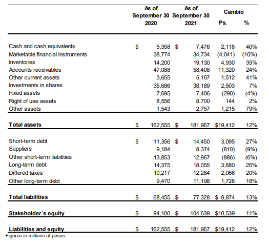 Consistent with this, the debt with cost was Ps.32,505 million as of September 30, 2021, compared to Ps.25,731 million in the previous year. The balance of cash and cash equivalents was Ps.7,476 million, from Ps.5,358 million from the previous year. As a result, net debt as of September 30, 2021, was Ps.25,029 million, compared to Ps.20,373 million a year ago.
