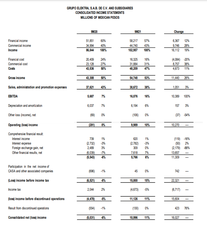 Consolidated revenues in the first nine months of the year grew 19%, to Ps.102,957 million, from Ps.86,844 million registered in the same period of 2020, driven by a 28% growth in sales of the commercial business and 12% in financial business income.