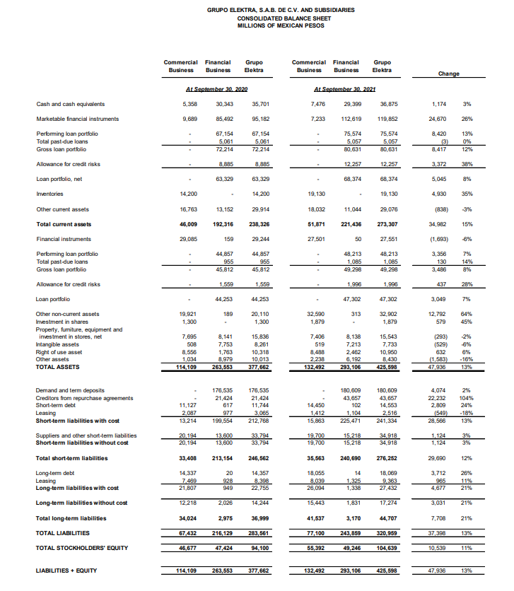 In order to allow the visualization of the non-consolidated financial situation, a pro forma exercise of the balance sheet of Grupo Elektra is presented, excluding the net assets of the financial business, whose investment is valued under the equity method, in this case.