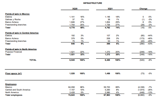 Grupo Elektra currently has 6,400 points of contact, compared to 6,945 units the previous year. The decrease is mainly due to the closure of 280 contact points in Latin America, largely derived from the sale of Banco Azteca del Peru in the fourth quarter of 2020, as well as the closure of 249 contact points of Purpose Financial in the United States — in the context of strategies aimed at boosting online credit operations and strengthening the company's operating efficiency.