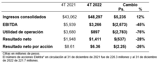 Grupo Elektra anuncia ingresos de Ps.48,297 millones y EBITDA de Ps.3,266 millones en el cuarto trimestre de 2022