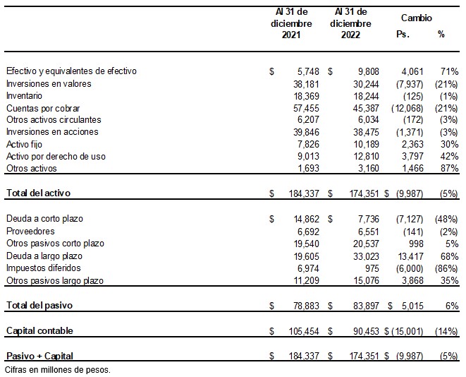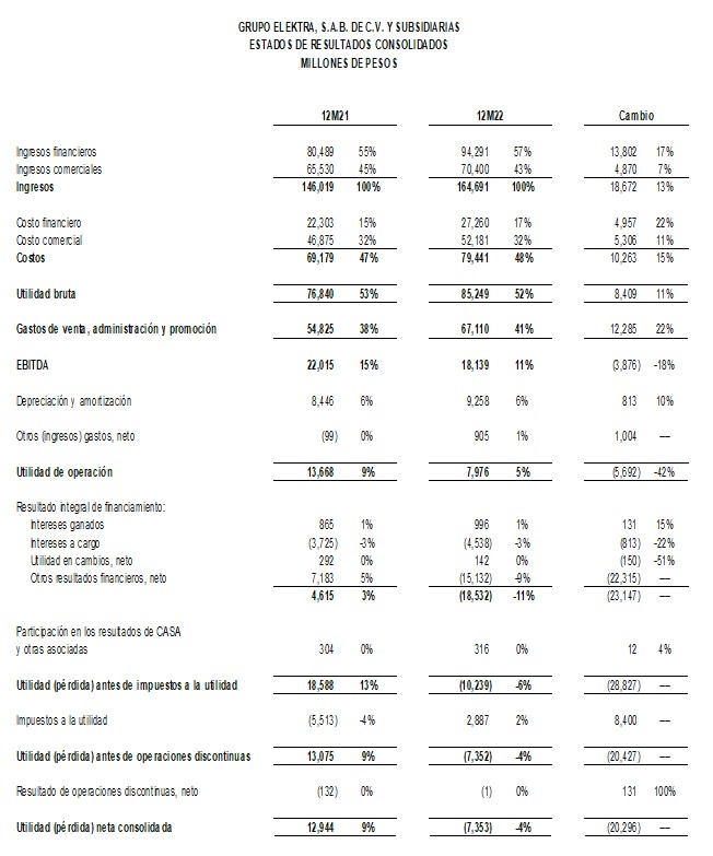 Los ingresos consolidados de 2022 crecieron 13%, a Ps.164,691 millones, a partir de Ps.146,019 millones registrados en 2021, impulsados por un incremento de 17% en los ingresos financieros y de 7% en las ventas del negocio comercial. El EBITDA fue de Ps.18,139 millones, en comparación con Ps.22,015 millones del año anterior. La compañía reportó utilidad de operación de Ps.7,976 millones, a partir de Ps.13,668 millones hace un año. En el año se registró pérdida neta de Ps.7,353 millones, en comparación con utilidad de Ps.12,944 millones hace un año. El cambio refleja, en buena medida, minusvalía en el valor de mercado del subyacente de instrumentos financieros que posee la compañía —y que no implica flujo de efectivo— en comparación con plusvalía el año previo.