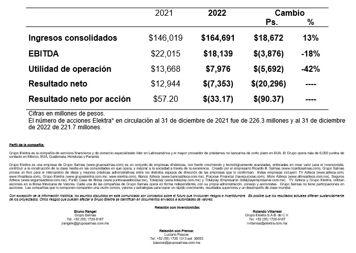 Ciudad de México, 21 de febrero de 2023—Grupo Elektra, S.A.B. de C.V. (BMV: ELEKTRA*; Latibex: XEKT), la empresa de servicios financieros y de comercio especializado líder en Latinoamérica y mayor proveedor de préstamos no bancarios de corto plazo en EUA, anunció hoy resultados del cuarto trimestre de 2022 y del año 2022.