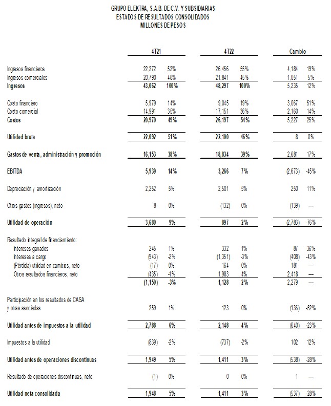 El EBITDA fue de Ps.3,266 millones, a partir de Ps.5,939 millones del año previo. La compañía reportó utilidad de operación de Ps.897 millones, en comparación con Ps.3,680 millones en igual trimestre de 2021. La variación más importante debajo de EBITDA fue un incremento de Ps.2,418 millones en el rubro de otros resultados financieros, que refleja plusvalía de 7% este trimestre en el valor de mercado del subyacente de instrumentos financieros que posee la compañía —y que no implica flujo de efectivo— en comparación con minusvalía de 1% hace un año. Grupo Elektra reportó utilidad neta de Ps.1,411 millones, a partir de utilidad de Ps.1,948 millones hace un año.