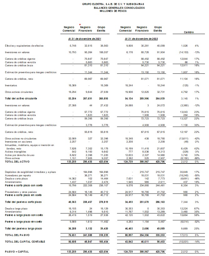 Se presenta un ejercicio de balance proforma de Grupo Elektra, que permite conocer la situación financiera no consolidada, excluyendo los activos netos del negocio financiero, cuya inversión se valúa en este caso bajo el método de participación. Dicha presentación muestra la deuda de la compañía, sin considerar los depósitos de exigibilidad inmediata y a plazo de Banco Azteca —que no constituyen deuda con costo para Grupo Elektra. El balance proforma tampoco incluye la cartera de crédito bruta del Banco. Ello brinda mayor claridad sobre la situación de los diferentes negocios que integran la compañía, y permite a los participantes de los mercados financieros, hacer estimaciones del valor de la empresa, considerando únicamente la deuda relevante para dichos cálculos. Congruente con ello, la deuda con costo fue de Ps.40,759 millones al 31 de diciembre de 2022, en comparación con Ps.34,467 millones del año anterior. El crecimiento del saldo de deuda se relaciona con emisiones de certificados bursátiles y créditos bancarios durante el periodo. El saldo de efectivo y equivalentes de efectivo fue de Ps.9,808 millones, a partir de Ps.5,748 millones del año previo. Al 31 de diciembre de 2022, el capital contable de la compañía fue de Ps.90,453 millones, y la razón de capital contable a pasivo total fue de 1.1 veces.