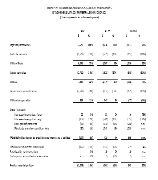 Como resultado, el EBITDA de Total Play sumó Ps.4,379 millones, a partir de Ps.3,331 millones del año previo. La compañía registró utilidad de operación de Ps.747 millones, en comparación con Ps.824 millones hace un año. Total Play reportó pérdida neta de Ps.101 millones, a partir de pérdida de Ps.1,003 millones en igual periodo de 2021.