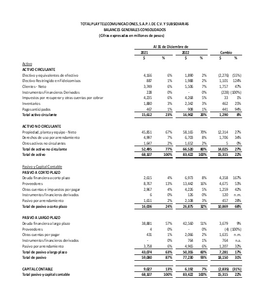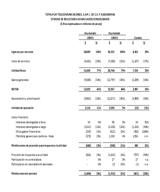 Ciudad de México, 23 de febrero de 2023— Total Play Telecomunicaciones, S.A.P.I. de C.V. (“Total Play”), empresa de telecomunicaciones líder en México, que ofrece servicios de acceso a internet, televisión de paga y telefonía, a través de una de las redes 100% de fibra óptica más grandes del país, anunció hoy resultados financieros del cuarto trimestre de 2022.