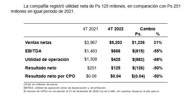 El saldo de efectivo y equivalentes de efectivo al cierre del trimestre fue de Ps.2,000 millones, en comparación con Ps.2,896 millones hace un año. La deuda neta de la compañía al 31 de diciembre de 2022 fue de Ps.7,449 millones, a partir de Ps.9,733 millones del año previo.