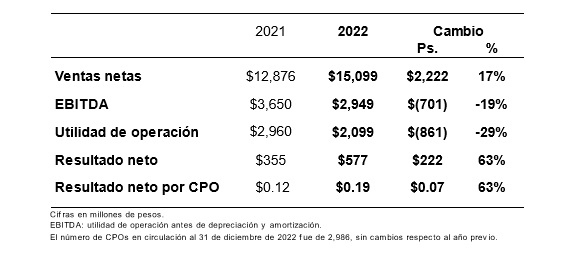 Las ventas netas del año 2022 sumaron Ps.15,099 millones, en comparación con Ps.12,876 millones del año previo. Los costos y gastos totales fueron de Ps.12,149 millones, a partir de Ps.9,226 millones en 2021.