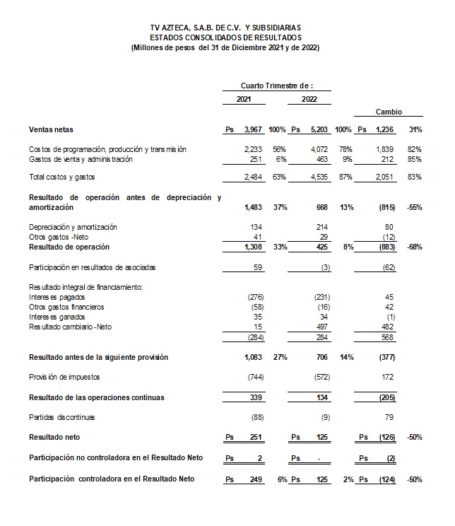 TV Azteca anuncia ventas de Ps.5,203 millones y EBITDA de Ps.668 millones en el cuarto trimestre de 2022