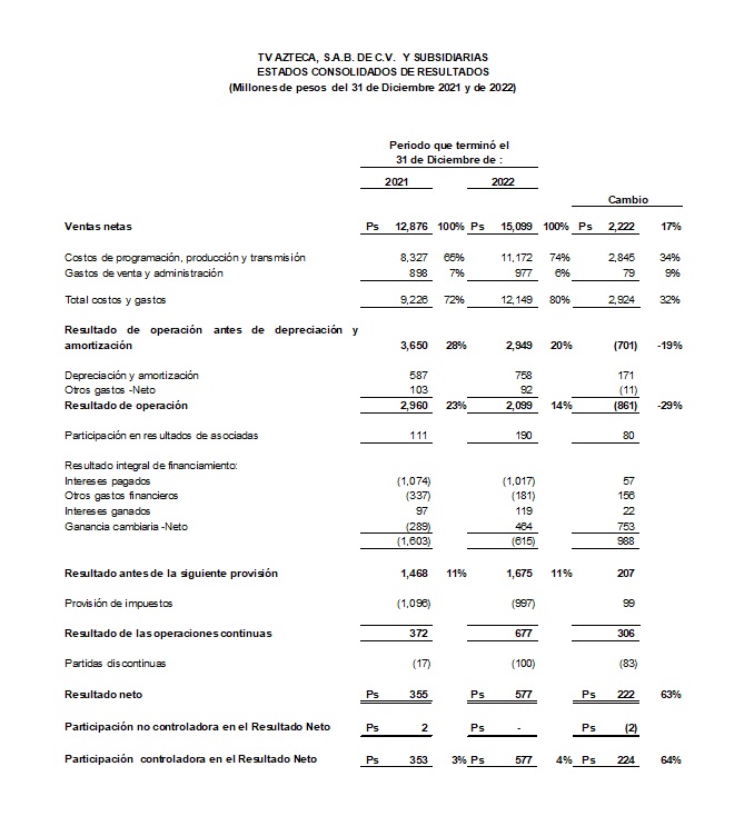“El incremento en ventas en el trimestre resulta, en buena medida, de ingresos relacionados con la transmisión de partidos de la Copa Mundial de Futbol de Qatar 2022; no obstante, el mercado de publicidad en televisión abierta en México continúa enfrentando fuertes limitaciones”, comentó Rafael Rodríguez, Director General de TV Azteca. “El crecimiento en los costos del periodo se deriva de derechos de exhibición y producción de contenidos relacionados con la Copa Mundial, así como generación de programación competitiva para preservar nuestro posicionamiento en el sector, mientras que el incremento en gastos refleja actividades operativas congruentes con los esfuerzos de producción superiores. A pesar del incremento en ingresos en el trimestre, los mayores costos y gastos afectaron negativamente al EBITDA”.