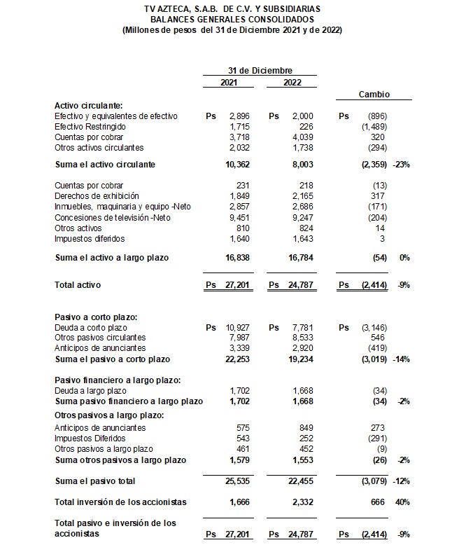 Al 31 de diciembre de 2022, la deuda con costo de TV Azteca fue de Ps.9,449 millones, a partir de Ps.12,629 millones del año previo.