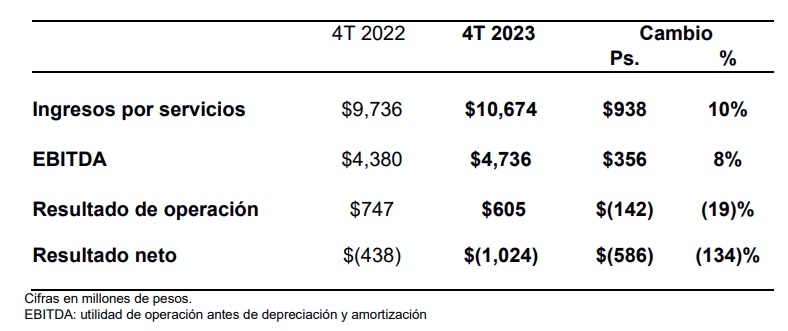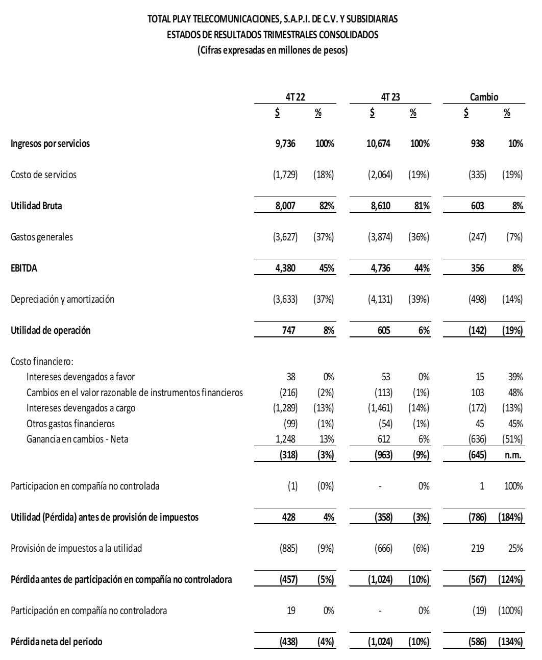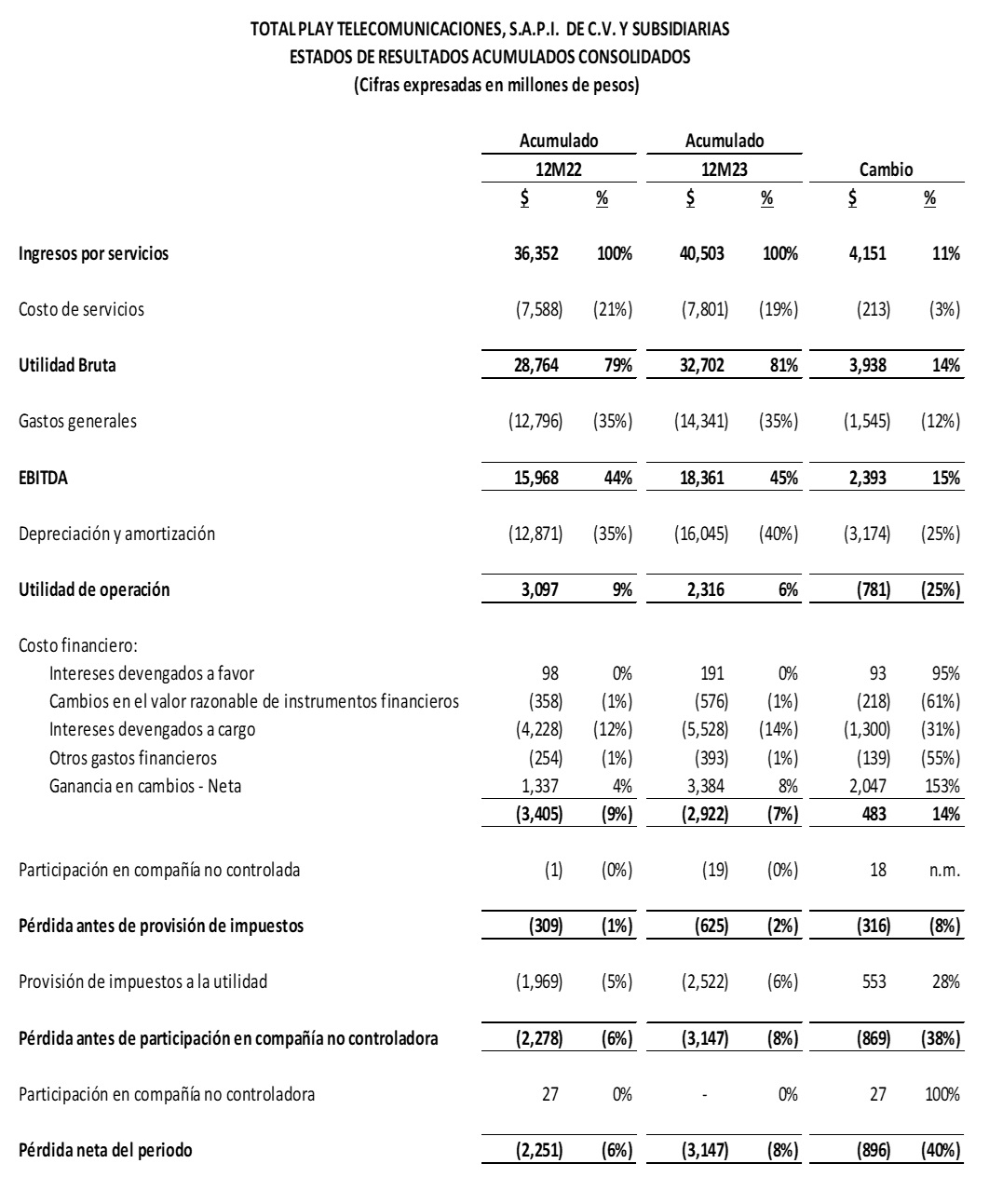 Total Play reportó EBITDA de Ps.18,361 millones, 15% por arriba de Ps.15,968 millones del año anterior; el margen EBITDA fue 45%, un punto porcentual por arriba del año previo. La utilidad de operación fue de Ps.2,316 millones, a partir de utilidad de Ps.3,097 millones en 2022.
