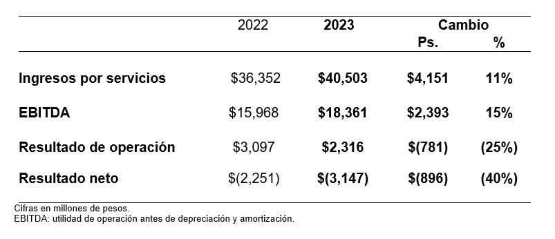 Los ingresos de 2023 sumaron Ps.40,503 millones, 11% por arriba de Ps.36,352 millones del año previo, en el marco de crecimiento de 13% en ingresos residenciales, a Ps.34,586 millones, y de 2% en ingresos empresariales, a Ps.5,917 millones.