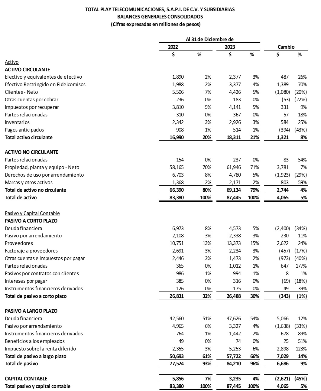 “De igual forma, se fortaleció de manera adicional el balance de la compañía, con un crecimiento de 48% en el saldo de efectivo y efectivo restringido, a Ps.5,754 millones al cierre de 2023, mientras que la adecuada planeación del perfil de vencimientos permitió reducir 34% la deuda con costo por préstamos de corto plazo,” añadió el señor Kuri. “Nuestra firme estrategia se tradujo en creciente solidez financiera este año y tenemos la determinación de impulsar aún más la liquidez y la fortaleza de la estructura de capital de Total Play hacia adelante.”